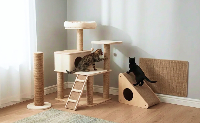 Эти модели — лишь часть ассортимента, но они хорошо иллюстрируют, как игровые комплексы, когтеточки и домики могут быть частью единой продуманной среды для вашего питомца.