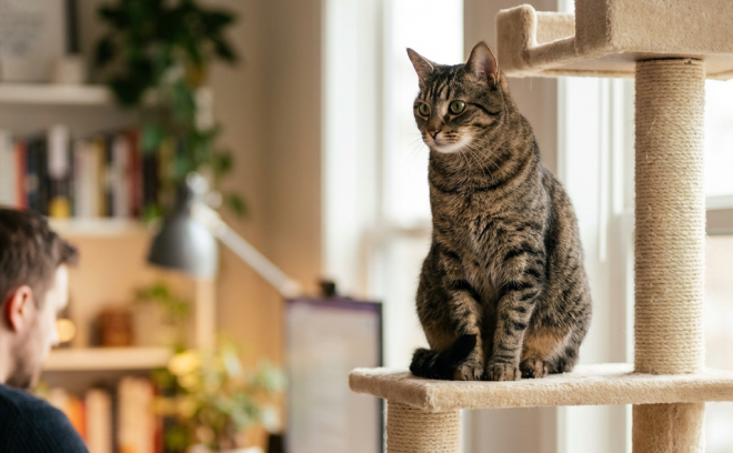 Разделите пространство физически. Рабочий стол — зона человека. Рядом — зона кошки (лежанка, домик). Важно, чтобы место питомца находилось в поле зрения: изоляция вызывает тревогу и усиливает требования внимания. Если кошка видит вас, но находится на своей территории, её потребность в контроле удовлетворена.