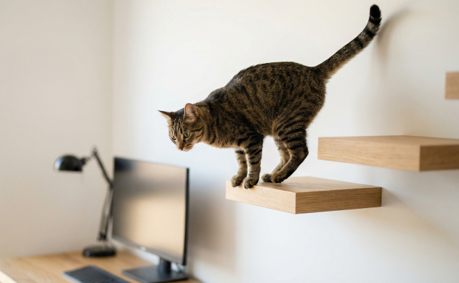 Отдельные полки, закреплённые на разной высоте, создают альтернативный путь перемещения. Кошка может перепрыгивать с уровня на уровень, не касаясь рабочего стола. Даже одна высокая полка у окна уже работает как наблюдательный пункт, снимая напряжение.