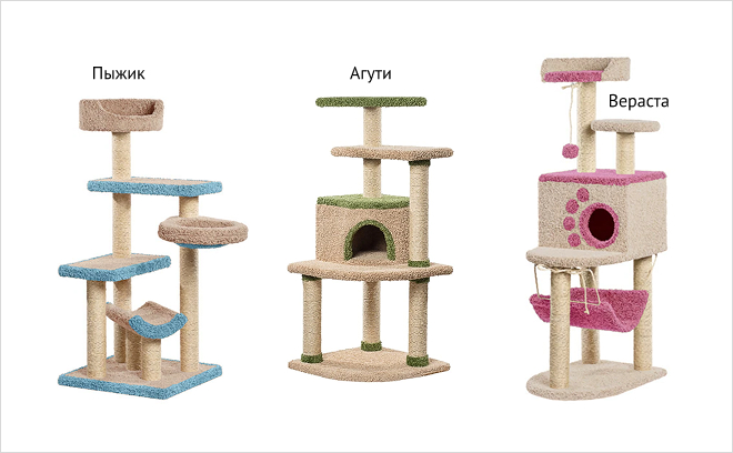 Для тревожных и застенчивых кошек идеальны закрытые домики с одним входом, например «Агути» или «Вераста» от компании Пушок. Расположенные на стойке, они дают ощущение защищённости со всех сторон. Для активных и любопытных лучше подойдут многоуровневые комплексы, такие как «Була» или «Пыжик» с переходами, гамаками и когтеточками. Это полигоны для снятия напряжения через игру и царапанье. Если квартира небольшая, спасением станут настенные полки и узкие вертикальные столбики. Например: «Фуката» или «Мегаряпушка», которые используют «мёртвые зоны» у стен, не занимая полезную площадь на полу.