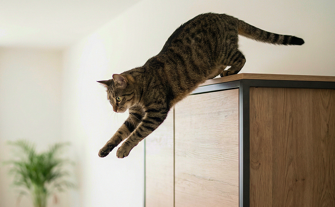 - Инстинкт безопасности. В дикой природе земля — зона наибольшего риска. Здесь проще стать добычей или быть застигнутым врасплох. Высота же воспринимается как укрытие, где кошка недоступна для потенциальных угроз. Если питомец залезает как можно выше, он инстинктивно выбирает самую безопасную точку в комнате.