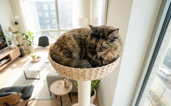 - Кошки — визуальные наблюдатели. Разместите высокую полку или домик так, чтобы с них открывался вид на окно или вход в комнату. Возможность следить за происходящим снаружи или контролировать перемещения домочадцев станет стимулом для смены локации.