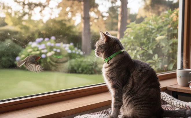 Если вам не хочется использовать ошейник — это нормально. Главное, чтобы кошке было комфортно и безопасно дома. В этом случае важно создать вокруг неё среду, в которой она себя чувствует уверенно и защищённо: хорошие домик-убежище, качественная когтеточка и любимые зоны для отдыха.