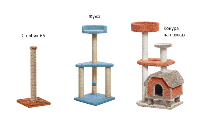 Интересным вариантом станут отдельные когтеточки и столбики, например Жужа или Столбик 65. Если домик у вас уже есть — можно дополнить его устойчивым столбиком для когтей, который подойдёт кошке, остающейся дома.
